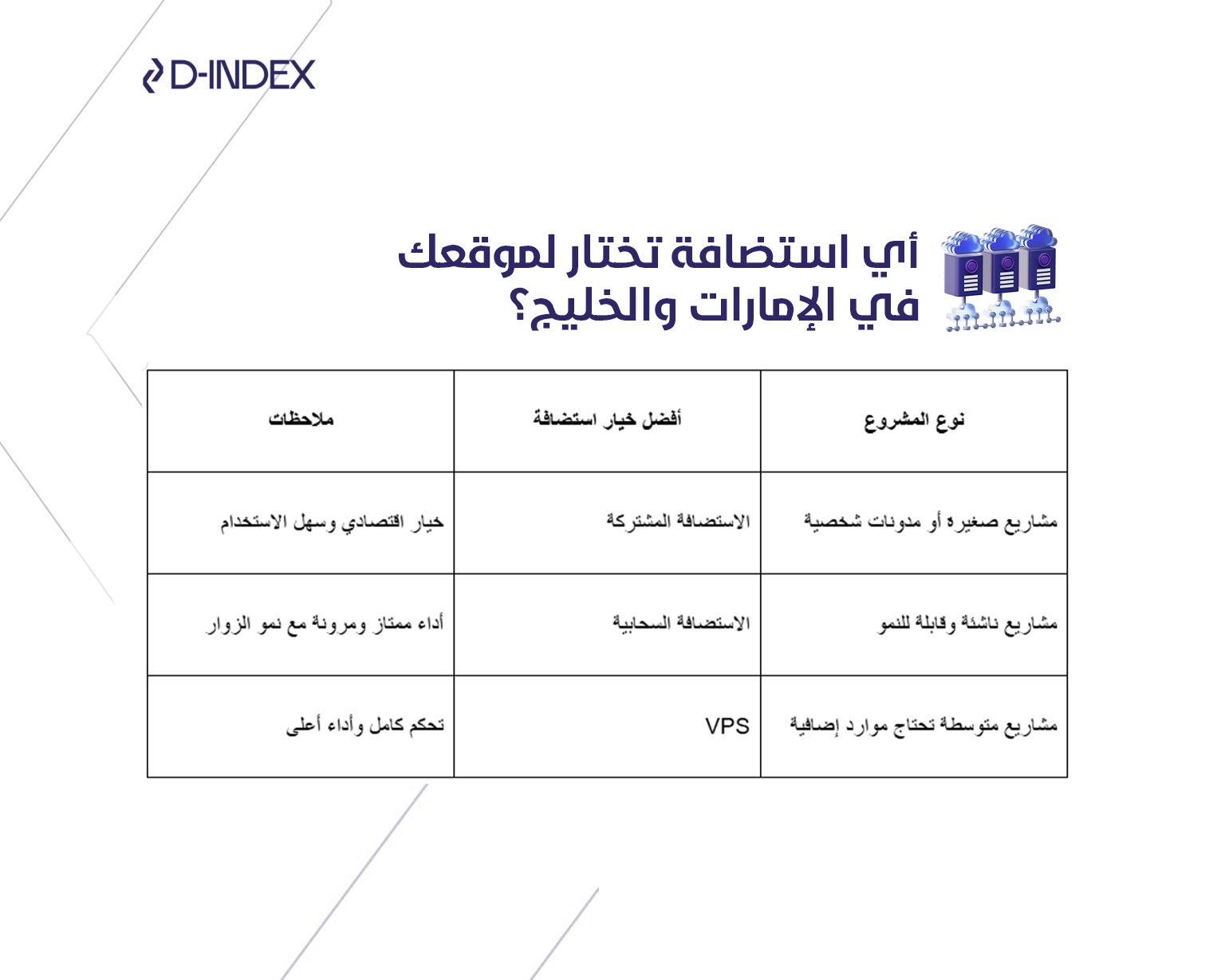 في D‑Index، نعتمد دائمًا على الاستضافة السحابية لمواقع العملاء في الإمارات والخليج، لما توفره من سرعة، استقرار، ومرونة تضمن نمو الموقع مع زيادة عدد الزوار.