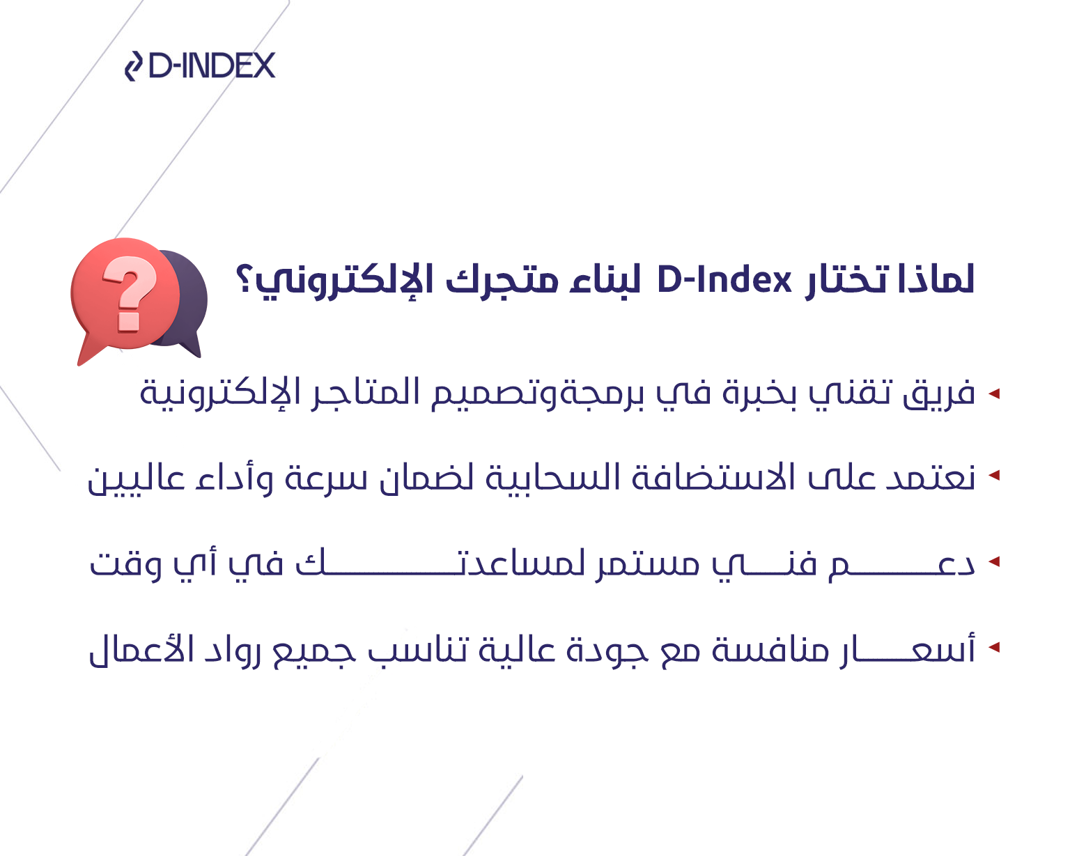 ابدأ مشروعك التجاري عبر الإنترنت مع D-Index واحصل على متجر إلكتروني احترافي متكامل بسعر مميز.